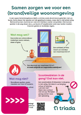 Sinds 1 juli 2024 is er een nieuwe wet over brandveiligheid. Triada moet zich aan deze regels houden. Daarom mogen er geen brandbare spullen meer in de algemene ruimtes staan en moet er minstens 85 cm loopruimte over blijven. Kijk in onze flyer brandveiligheid voor meer informatie. Meer informatie over dit onderwerp kun je vinden op de website van de brandweer. Hieronder vind je antwoorden op veelgestelde vragen.